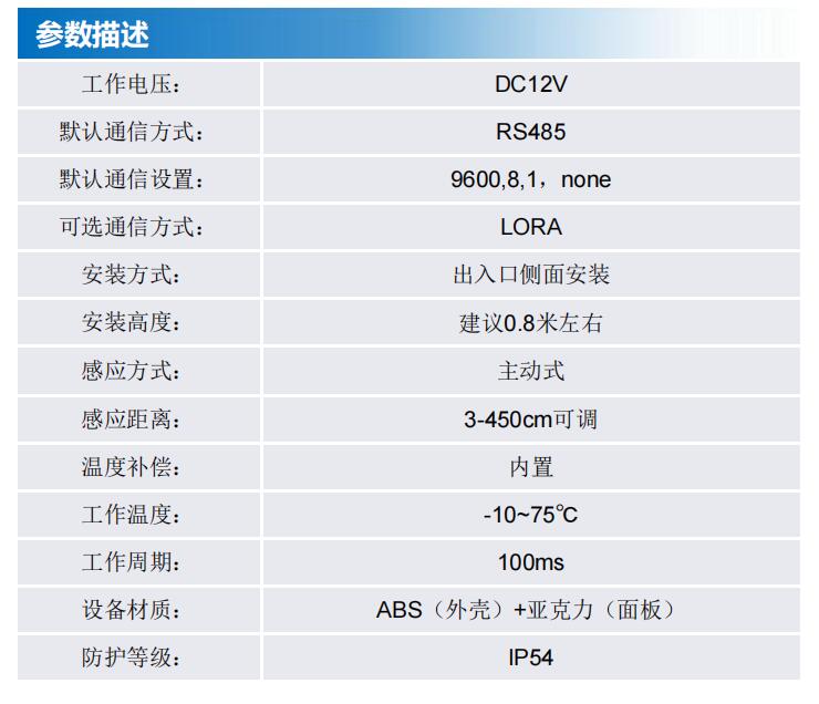 使用超声波原理探测客流量的传感器,设备不受天气、温度、湿度 、颜色、透明度、材质的影响,具有精度高、反应速度快、测量范围广 、抗干扰型强的特点,设备外观小巧、安装方便、稳定性高,可以广泛 应用在厕所出入口、商场、超市、景区等需要统计客流量的场所。